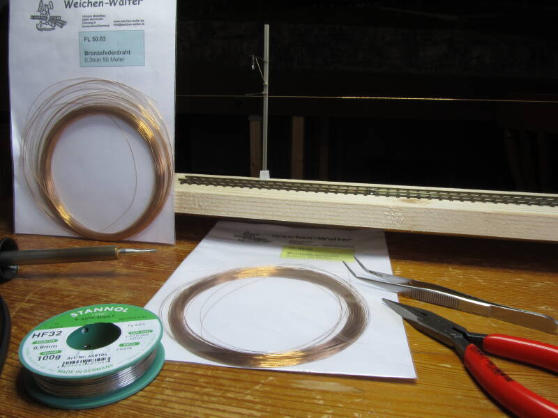 De 0,3 mm dunne rijdraad wordt aan de 0,5 mm zaijwaartsen gesoldeerd. dat doe ik op houten klossen. Op de foto's is te zien dat hiervoor verschillende mogelijkheden zijn. nauwkeurig meten en vastzetten is een vereiste. Het solderen gaat vrij gemakkelijk. Na het afkoelen is het niet meer los te trekken! Wel dient goed gelet te worden op een juiste afspanning. Een te slappe draad betekent alles weer losmaken!
