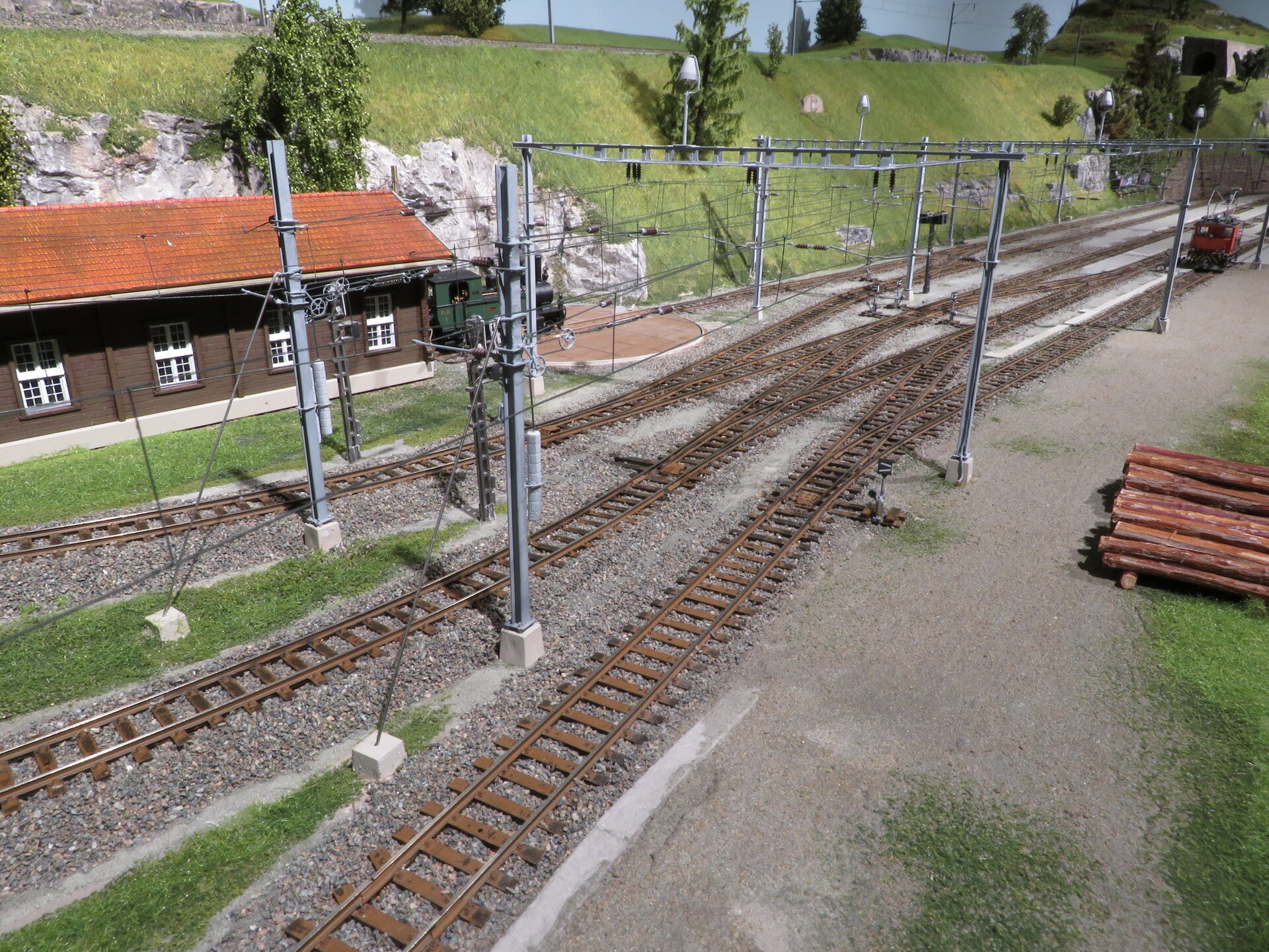 De scherpe hoek in de rijdraad wordt in de werkelijkheid wel door een dubbele zijwaartse in vorkvorm vastgezet. Dat heb ik maar niet gedaan.