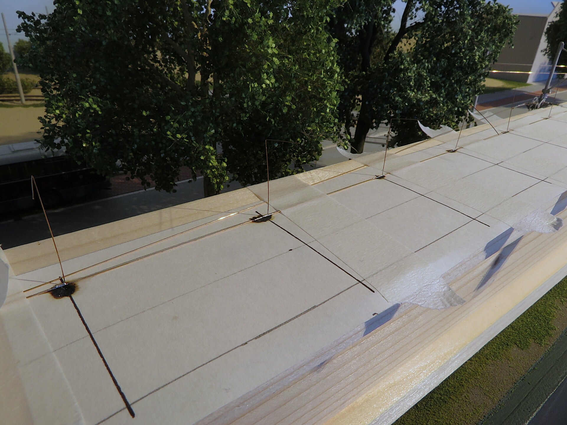 Ik heb nu mijn modeltrambaan naar voorbeeld van de HTM van zelfbouw bovenleidingdraad voorzien. Daarvoor maakte ik ook de masten. Snaar strak afspannen kon niet. De dunne messingbuisjes trokken krom.